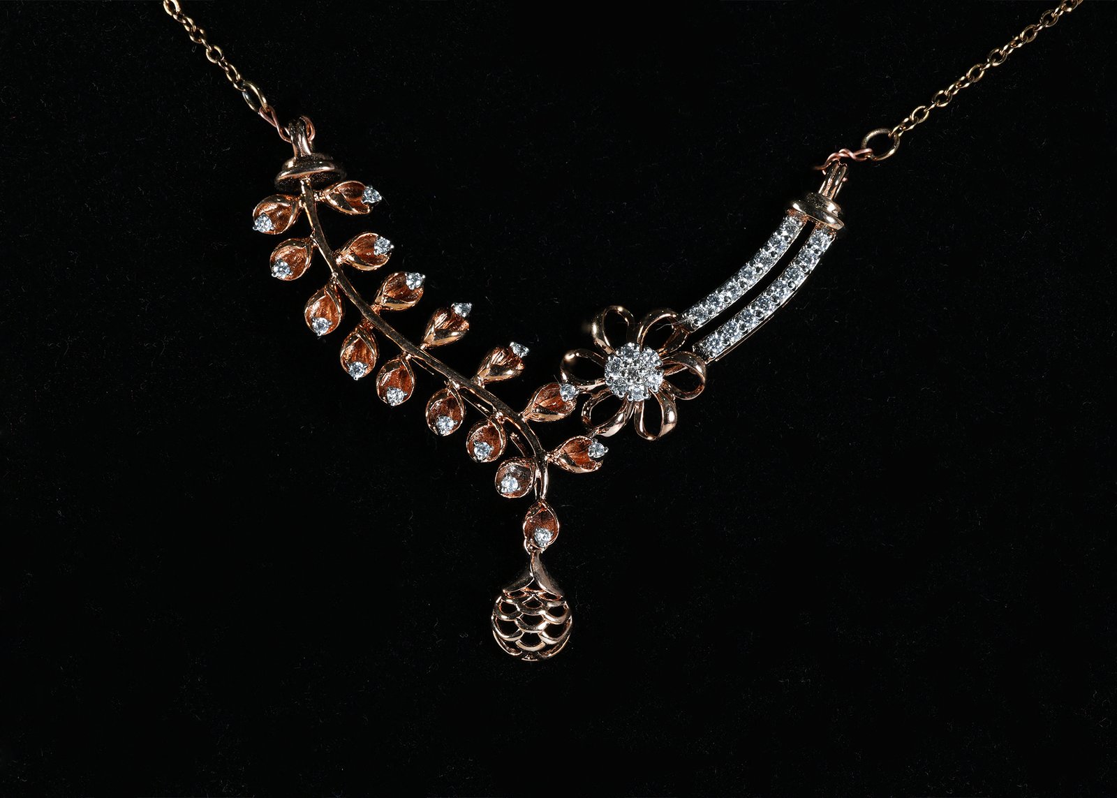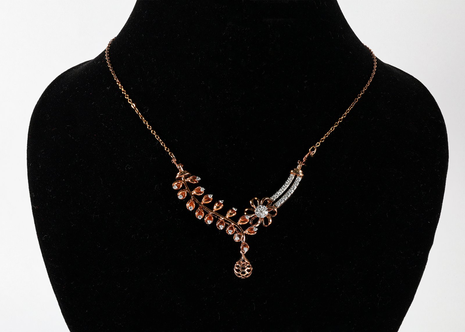 A beautifully crafted mangalsutra featuring a delicate floral centerpiece with sparkling stones, paired with a graceful vine of leaf motifs. The elegant drop pendant adds a touch of charm, creating a design that celebrates love, beauty, and timeless femininity.