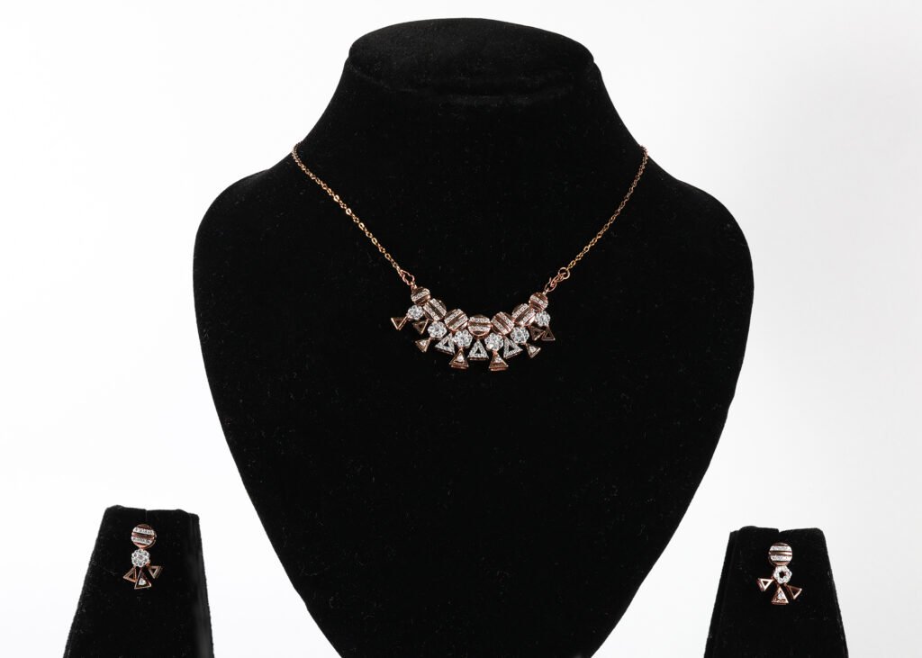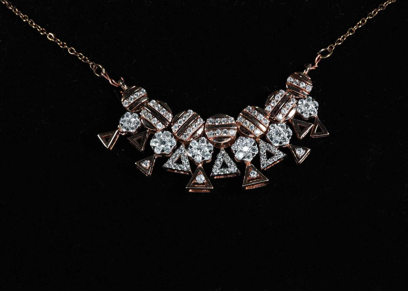 A graceful blend of modern geometry and timeless elegance, this mangalsutra features delicate triangular motifs paired with sparkling stones, forming a radiant centerpiece. The warm gold chain enhances its refined charm, making it perfect for both everyday wear and special occasions.