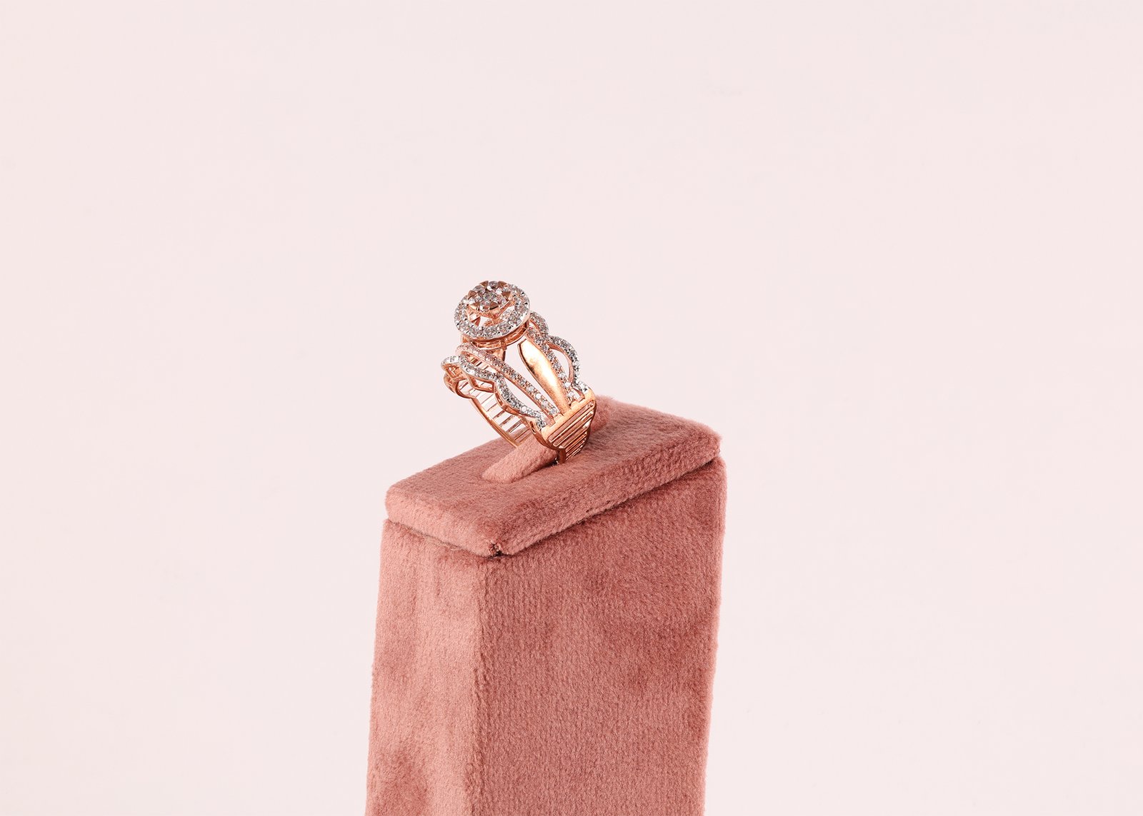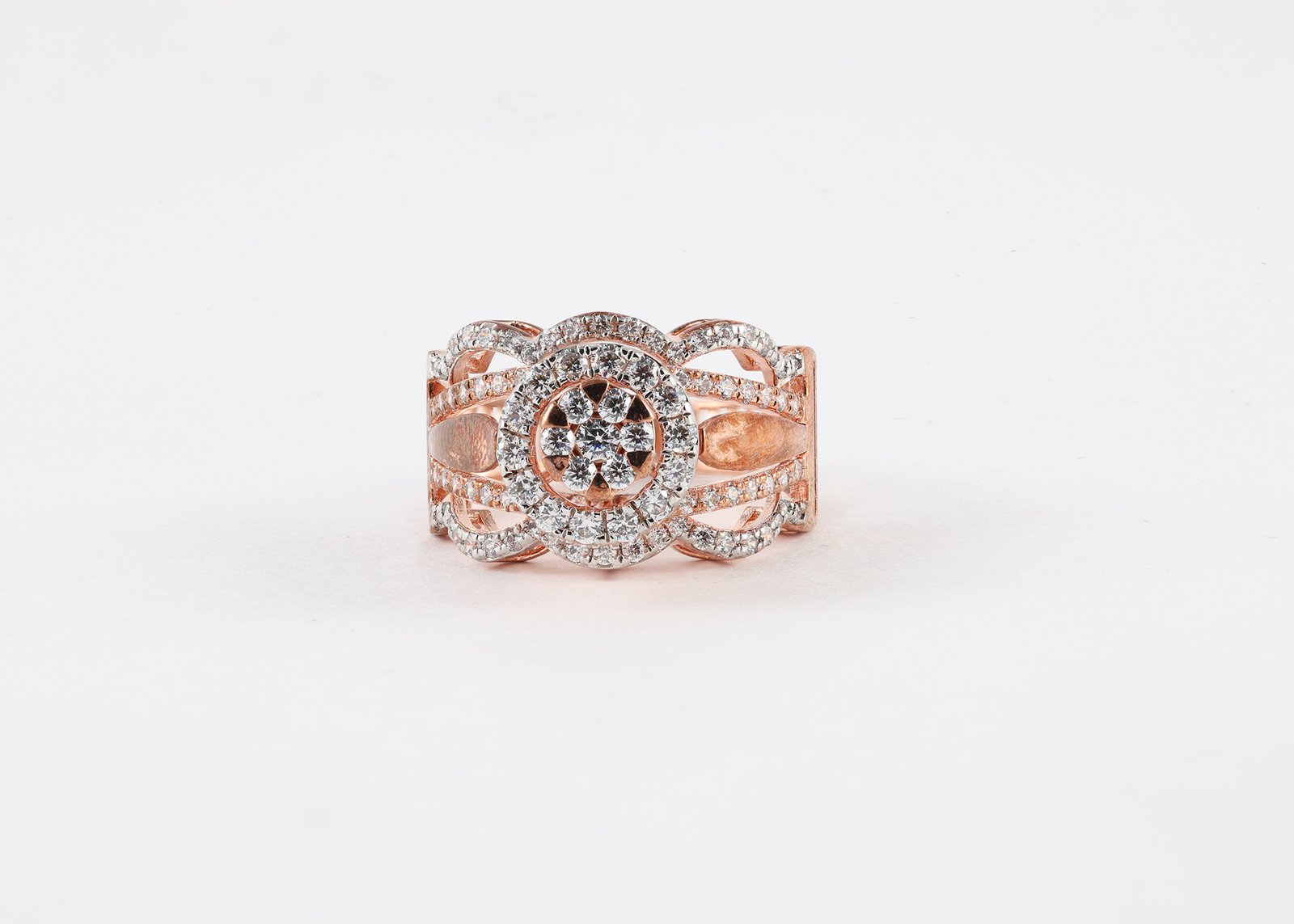This elegant rose gold ring features a stunning round cluster of sparkling diamonds at its center, surrounded by a delicate halo of smaller diamonds for added brilliance. The beautifully crafted band showcases an intricate openwork design with multiple diamond-studded rows that gracefully curve around the center, creating a sophisticated and luxurious look. Perfect for special occasions or everyday glamour, this ring combines modern elegance with timeless sparkle.