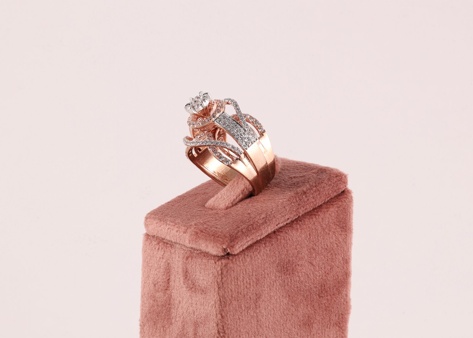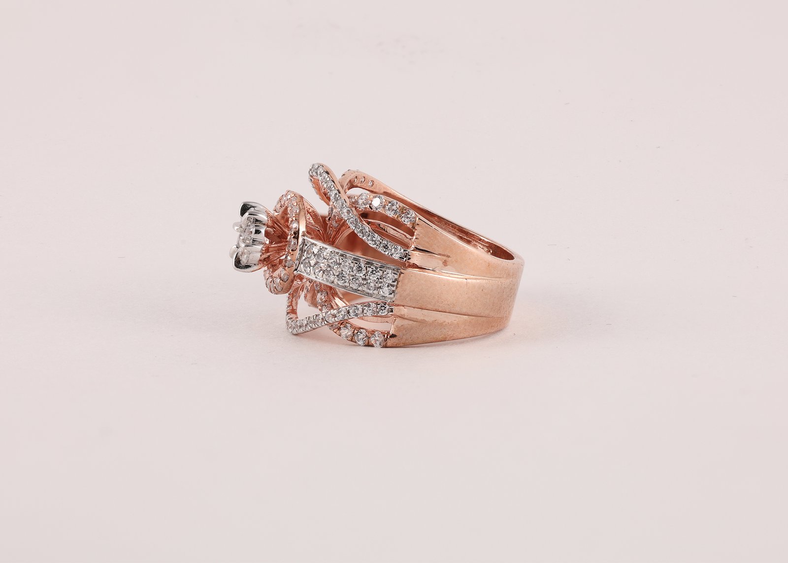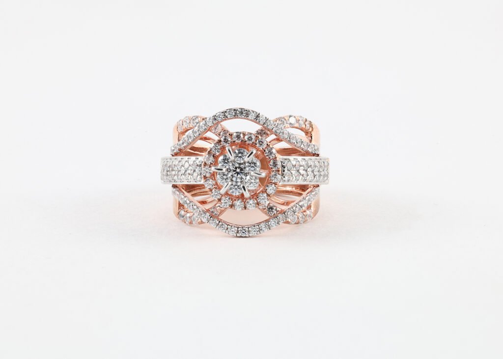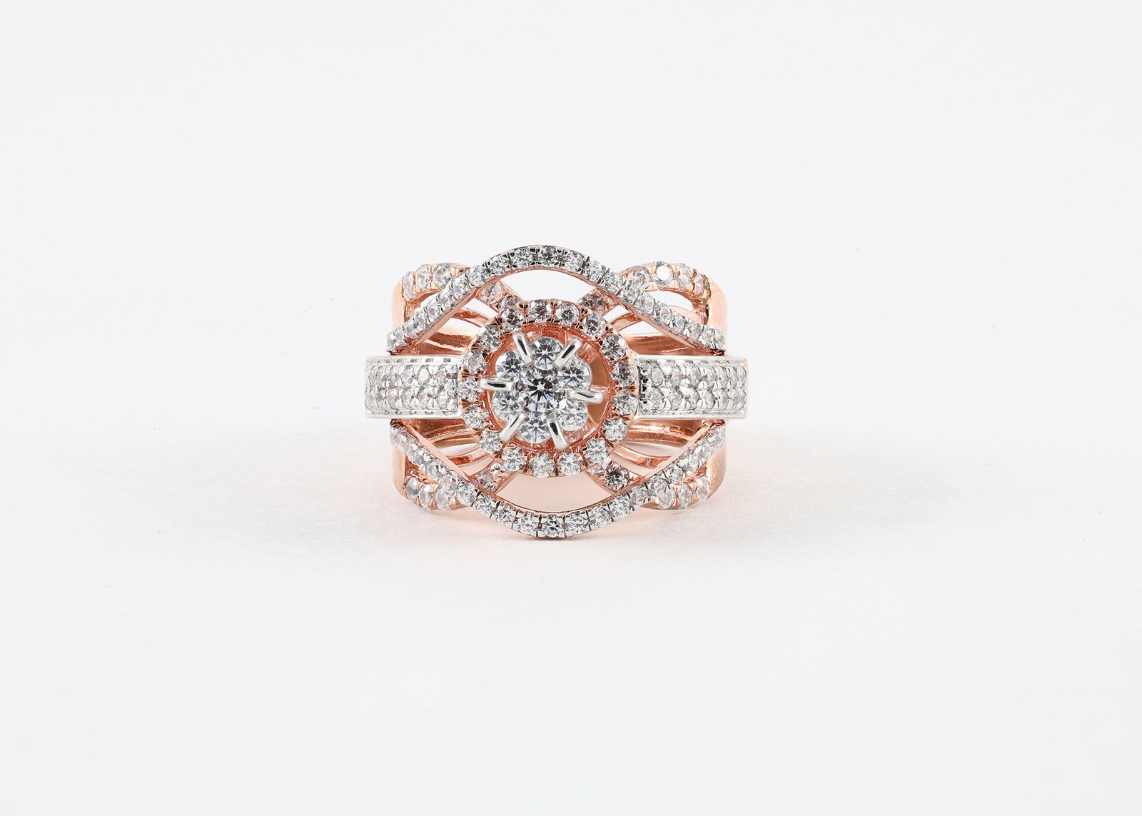 This stunning rose gold ring features a brilliant round center diamond surrounded by a sparkling halo. The intricate crisscross design, lined with shimmering diamonds, adds depth and elegance, creating a luxurious and eye-catching statement piece.