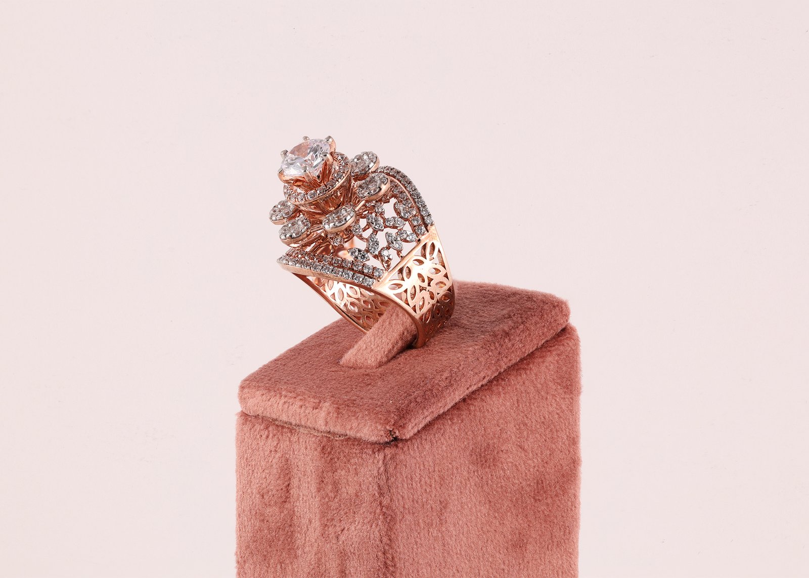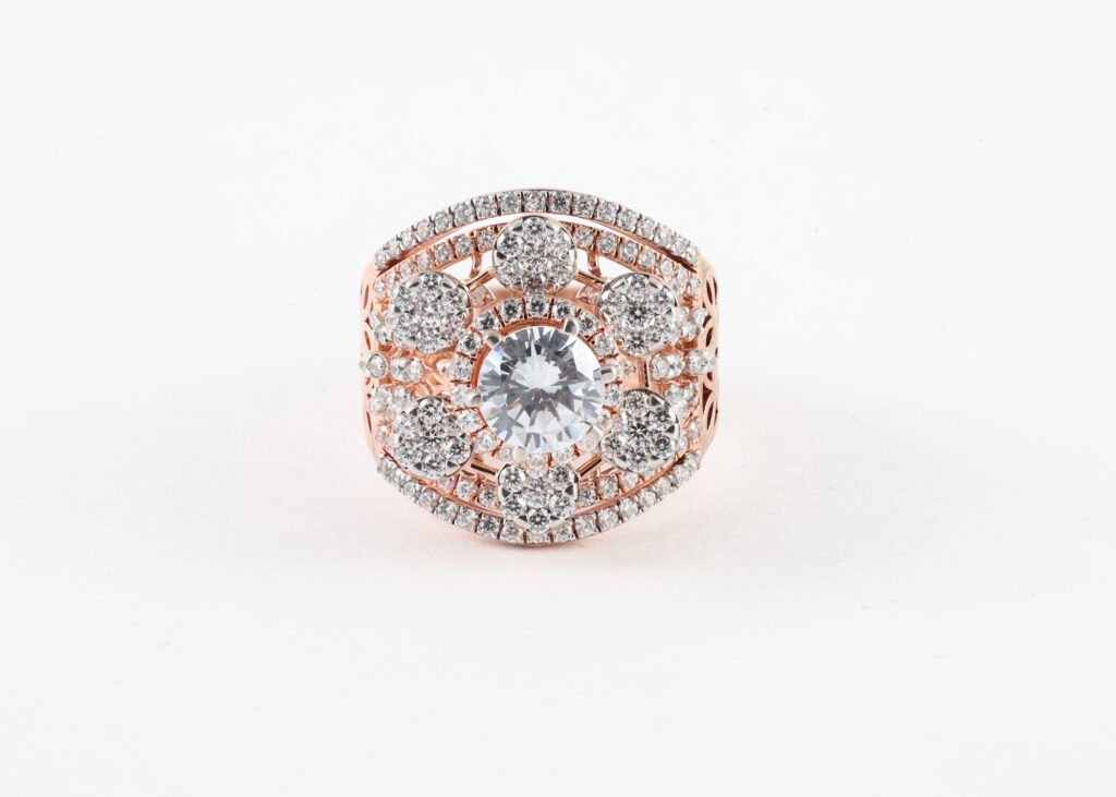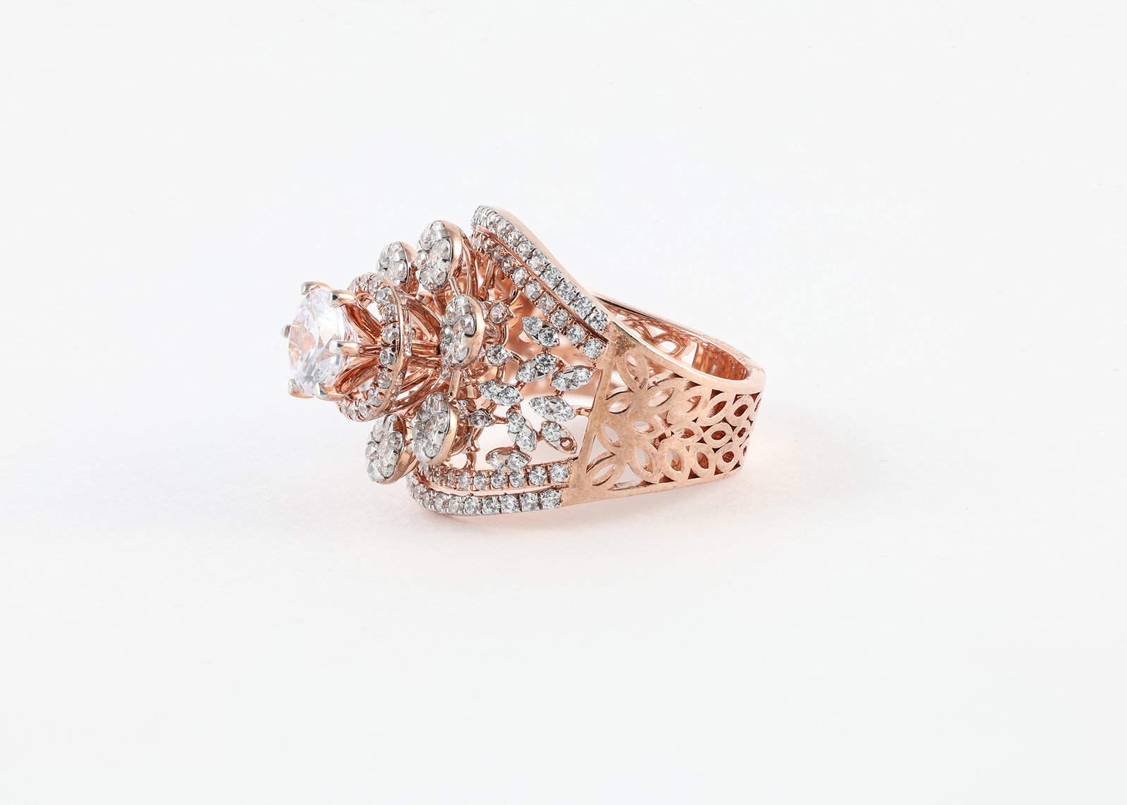 A stunning rose gold diamond crown ring featuring a brilliant round-cut center stone surrounded by a delicate floral-inspired cluster of sparkling diamonds. The elegant split band is lined with pavé-set diamonds and finished with intricate openwork detailing, adding depth and sophistication. A perfect statement piece that blends luxury, craftsmanship, and timeless elegance.